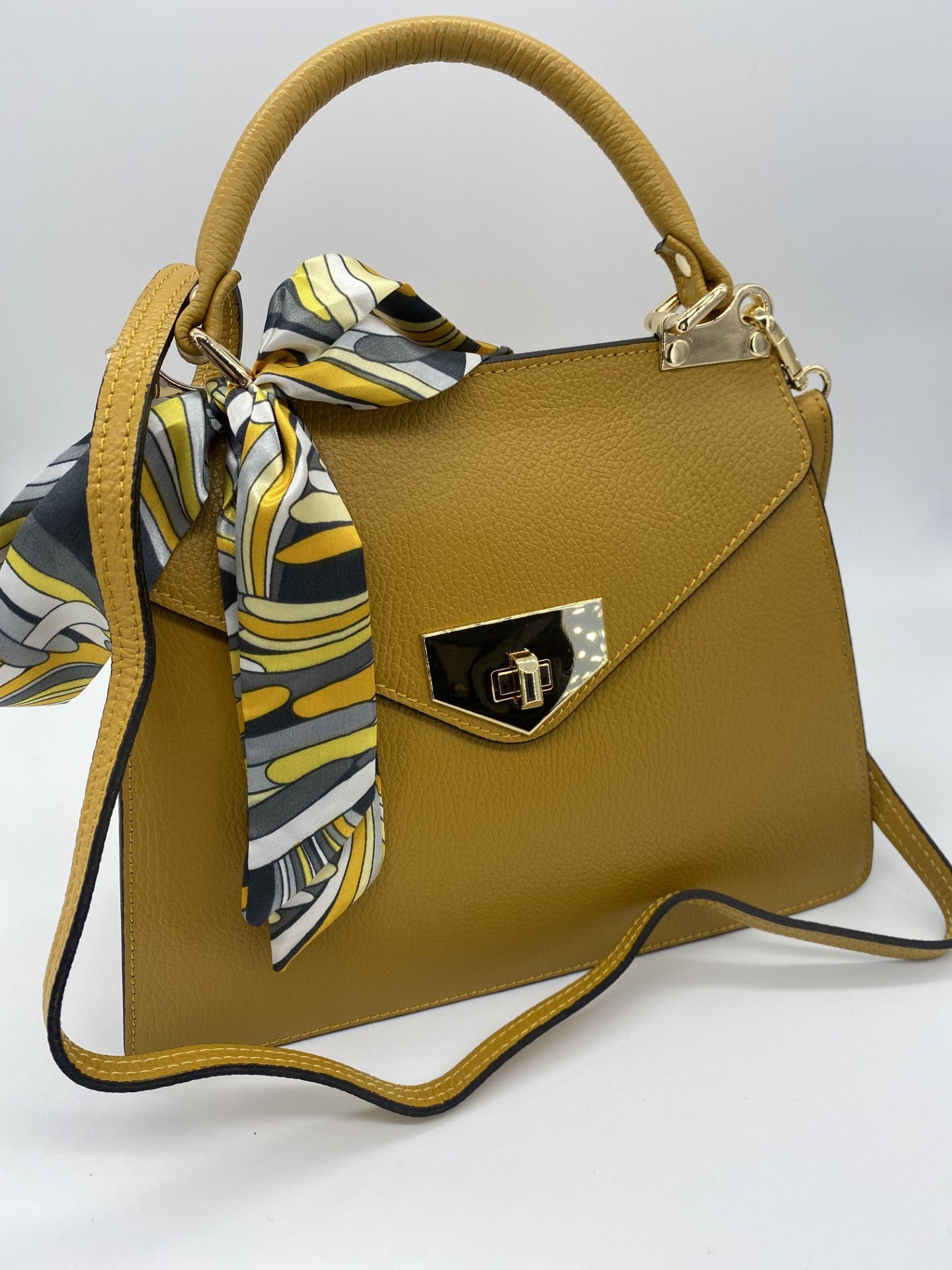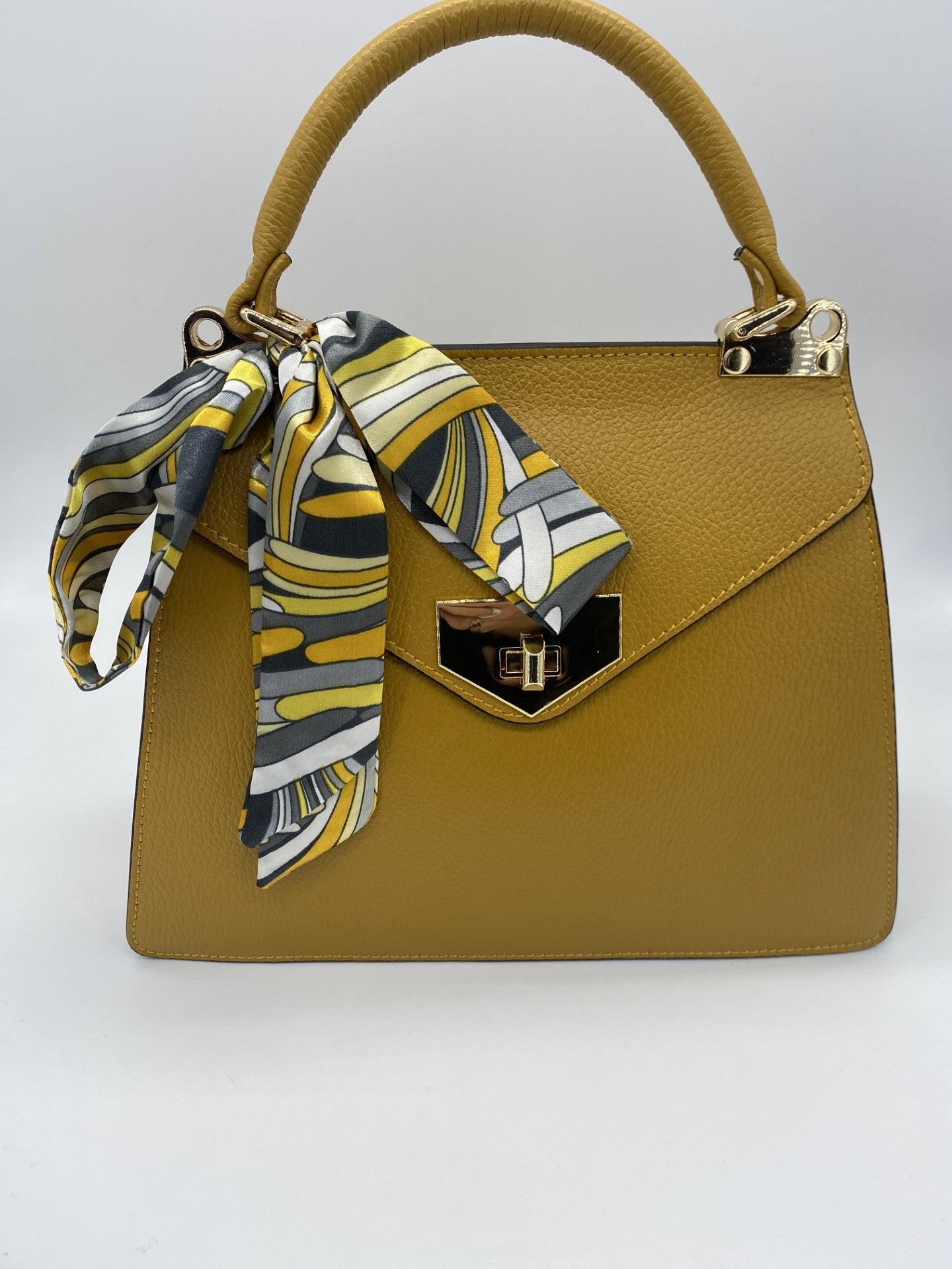 Osez l’originalité avec ce sac moutarde dorée, un accessoire qui marie parfaitement chaleur et éclat. Sa teinte moutarde vibrante, à la fois audacieuse et chic, avec son foulard noué avec délicatesse sur l’anse.